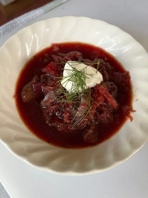 We started with Ukrainian Borscht (beetroot soup), served with a sour cream and dill garnish and crusty bread. The main course was Ukrainian Chicken Paprika (with a green lentil version for the veggies), crushed pan-roasted potatoes with chives and pan-roasted savoy cabbage with caraway. Dessert certainly didn’t disappoint either - Slavic Sweet Pine Cones - luckily there wasn’t a real pine cone in sight! They were made from Polish fudge, puffed rice and sesame seeds, served with Chantilly cream, chocolate branches and fresh fruits of the forest. All of this deliciousness was followed by coffee and bitter mints… yum!